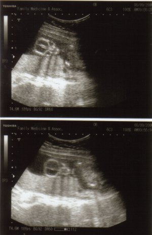 September 21, 2006: I forgot completely to ask the doctor about my AFP results, but since he didn’t mention anything I’m guessing everything’s A-OK. Baby again looks “fuller” than she did at my previous appointment, which was three weeks ago. She’s measuring perfectly and weighs approximately 0.8 lbs :). Her heartrate was at 145 BPM, though the monitor read 155. She was moving around (I got to see her little knees, feet and hands!) and Dr. C. said her head’s where my belly button is and her feet are at the bottom of my pelvis. No wonder I feel strange little jolts down there! I had glucose in my urine for the second time, but after checking me with the diabetes monitor it turns out I’m fine. Must have been the chocolate milk I drank in the morning. I’m feeling her move more after lunchtime and A LOT at 11pm. Mario finally felt her kick on 9-15-06!