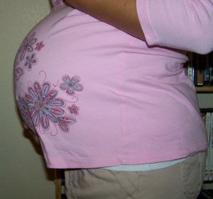Ailments/Happenings: No nausea, thank God. 1 sinus headache that lasted a whole day. 1 migraine headache + nausea. Nips don’t hurt as much but are still a little sore. Acne isn’t as bad. Round ligaments still cause a lot of pain. Had been having heart palpitations and shortness of breath due to a heart murmur but I’m fine as long as I take it easy. Caught a “summer cold” on 8-9-06.