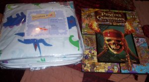 After browsing through the one rack of Small clothes I ended up with 3 blouses and 1 pair of black cargo pants. I wanted more, but I had a budget so I didn’t spend any more. They have such cute Halloween stuff and so many nice bed sheets and comforters. I got some dinosaur sheets for Jaylen’s twin bed (whenever we get it) and a Pirates of the Caribbean Spy book for the boys to share.