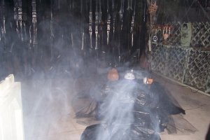 That’s Jaylen (without his costume) and eating his nachos. Eenan and Brandon won a 3-liter and 1-liter soda (respectively) when they played a ring toss game. We got all the kids nachos and raspas and that’s basically all we did. We got home at 7:30, dropped the kids off, picked Ricci and her girls up (her cousin, Alex, and new boyfriend, Goyo, brought her sister and cousin), and when we got home I was greeted by everyone rushing me to get ready since they were ready to let the kids into the haunted house. I didn’t get to take a shower, shave my legs (and boy did they need shaving!), curl my hair, put makeup or my glitter on—nothing! All I did was put my dress and wings on and that’s it.